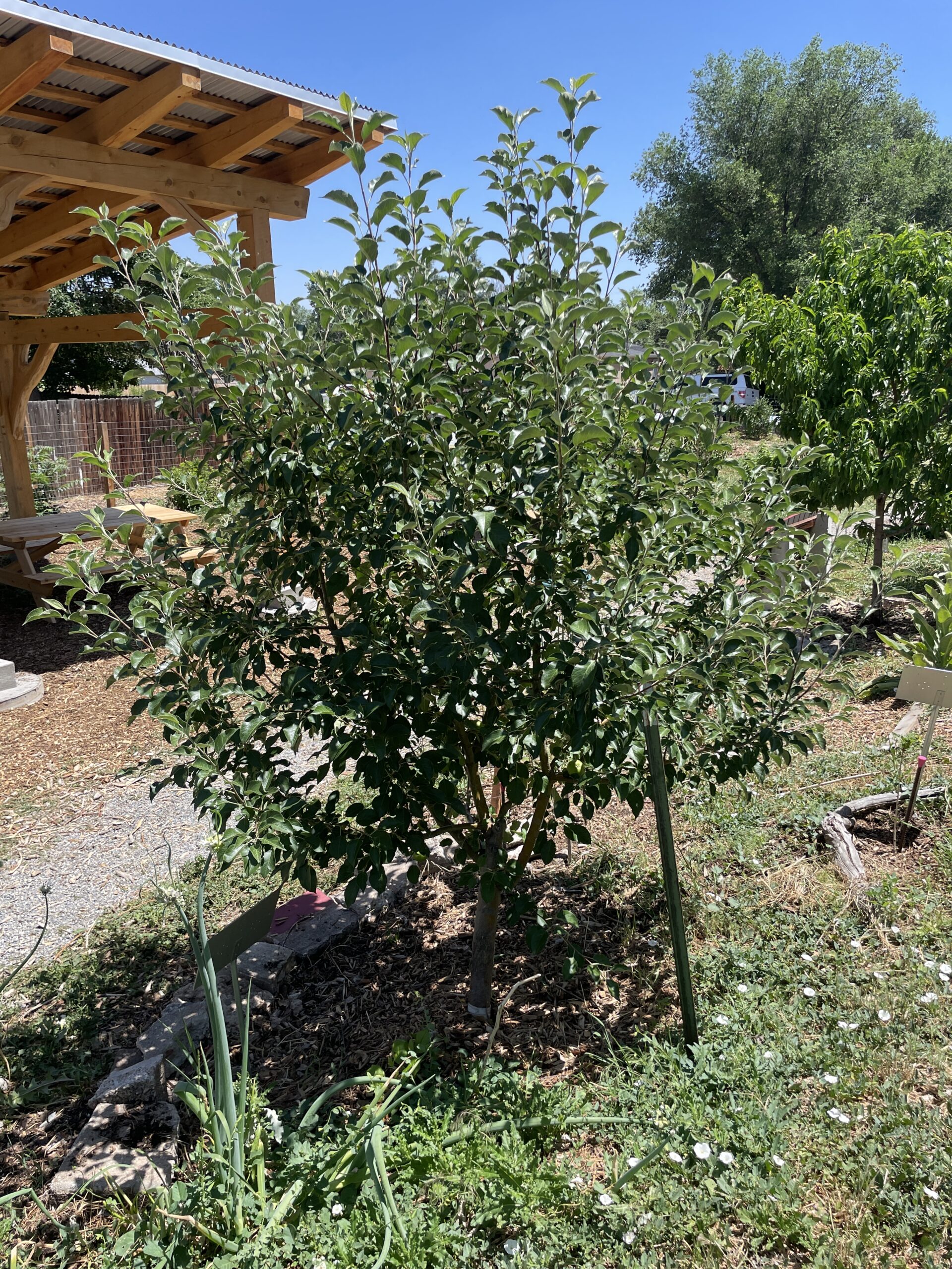 Growing 15 to 25 feet, peach trees have reddish-orange new growth and are shorter-lived than other fruit trees. Peaches are drought- and heat-tolerant, but their branches can break easily. Although peaches are an iconic Colorado fruit, they are vulnerable to late frosts on the Front Range and must be planted in a cooler place to fruit consistently. Susceptible to gummosis and peach borer, peaches are good for fresh eating and preserves.